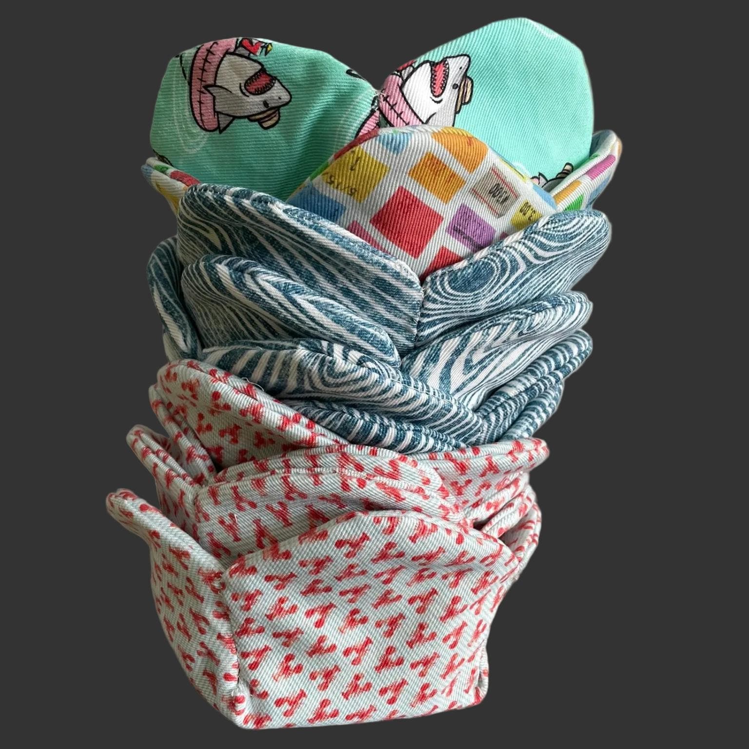 Dogwood Denim 100% heavy cotton fabric Fits most standard cereal and soup bowls 100% cotton fabric and batting Microwave safe for reheating (not for extended cooking) Reversible, two coordinating fabrics Handmade, so slight variations keep things interesting
